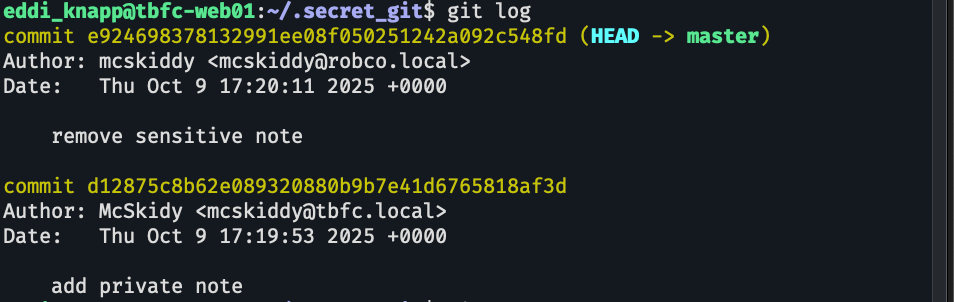 setelah kita masuk dan lakukan git log untuk melihat riwayat commit, kita mendapatkan clue lagi
